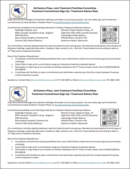 A flyer for GSRs to share about becoming a treatment advisor or carrying AA's message into treatment facilities: click here for flyer